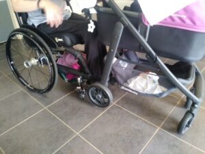 Our client is paraplegic and uses a manual and a powered wheelchair. She has just had her first baby and asked Tadvic to provide a connection between the wheelchairs and a stroller so she can move her child around.