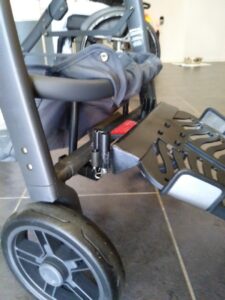 For the powered wheelchair our client drives the footplate under the rear axle of the stroller and lifts the axle with the powered footplate. When not using the stroller the connection folds back flat with the footplate.